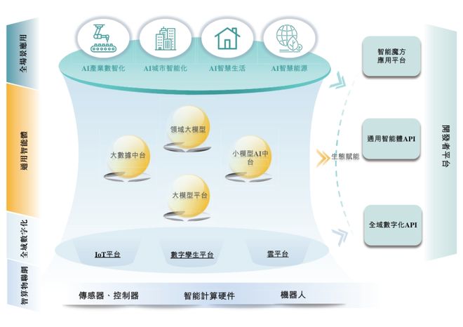 TacOS采用分层设计,既能以整体平台进行部署,又能以各子系统组件化和模块化灵活部署,实现平台的规模化落地。TacOS 的技术架构由五层构成,依次为智算物联网、全局数字化、通用智能体、全场景应用及开发者平台。