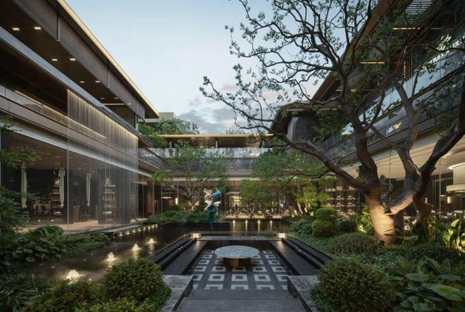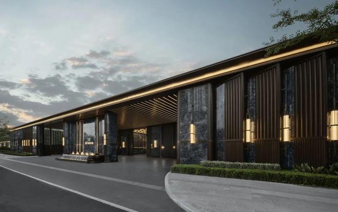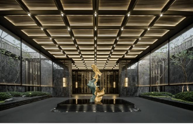 (仅9/10号楼北侧配置),两侧全金属高定柱式、金属帘,搭配地面福鼎黑石材,对景为普拉达绿奢石,还有满铺水纹琉璃马赛克的度假戏水池……虚实交错间,整个空间变得灵动而轻盈,仿佛在诉说着一个古老而又鲜活的故事。
